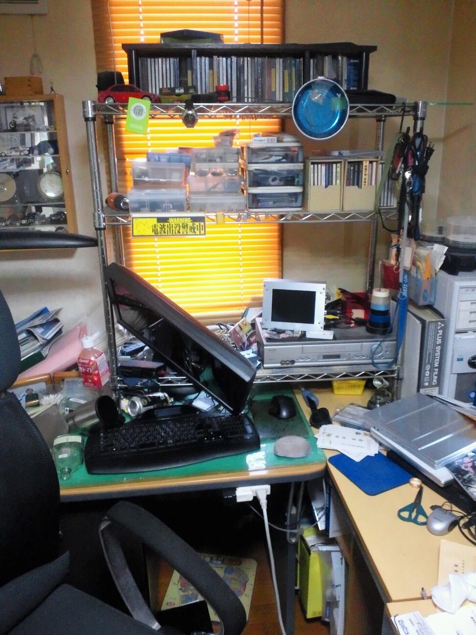 今は棚もすべて耐震固定してるし、モニタもアームなので倒れない。